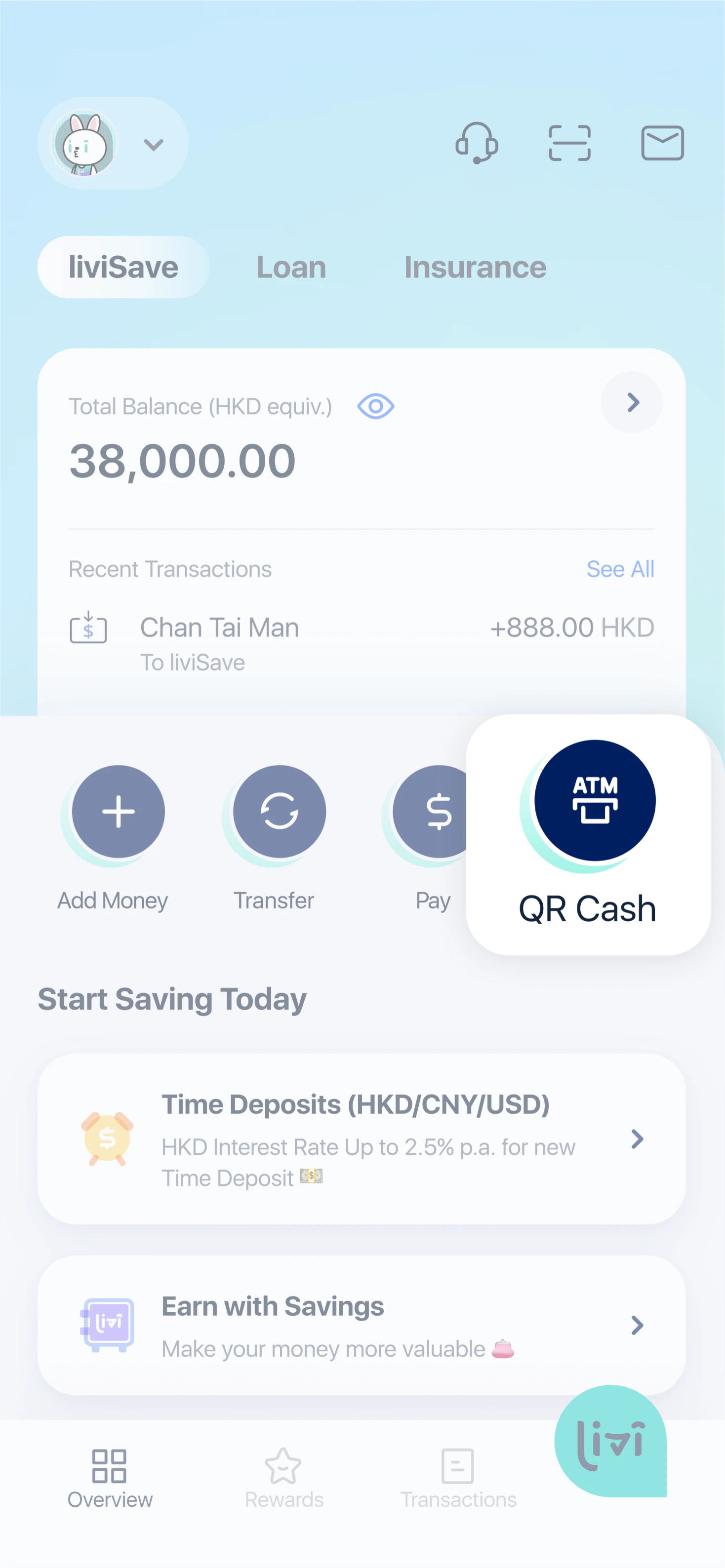 QR Cash enables you to withdraw cash from the designated ATMs without a physical ATM card. Each withdrawal will be directly debited from your liviSave account. Currently, all BOCHK and other designated ATMs support this service. Cash withdrawal records can be viewed in "Transactions" in app and in the e-statement.